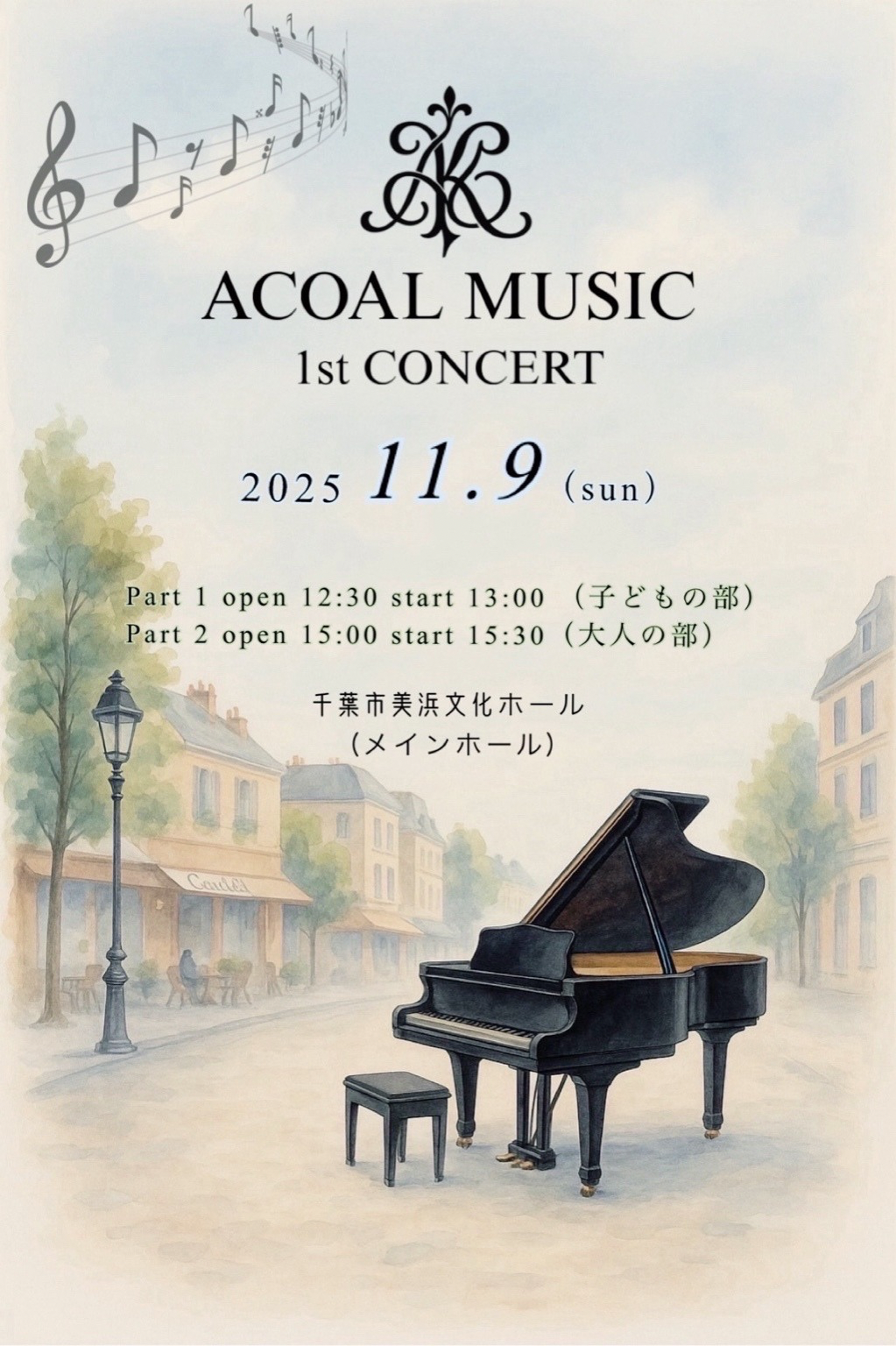 【第1回 Acoal Music Concert 開催のお知らせ】kunkun_piano@icloud.com2025年9月19日お知らせ・イベント情報 2025年11月9日(日)、千葉市美浜文化ホールにて 「第1回 Acoal Music Concert」を開催いたします。 とても楽しみです! ポスターが出来ました!Mちゃんが(高校生)が手伝ってくれました❤️