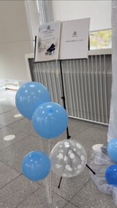 発表会2025 ④kunkun_piano@icloud.com2025年11月20日Uncategorized 受付横のコーナーには、水色と白を基調にしたバルーンを飾りました。朝から4名の生徒さんたちと一緒に、5〜60個の風船をふくらませて完成させた思い出のデコレーションです🎈素人の私達で作成していたところ、途中からプロのフローリスト美樹さんがお手伝いくださり、華やかさと上品さが一気に広がった特別な空間になりました‼️